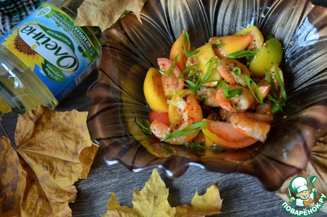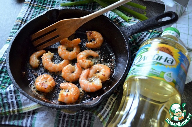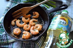 Креветки почистить, обжарить на 1 ст. л. растительного масла, я использую растительное масло ТМ "Олейна", качество на высоте. Горячими переложить в салатник.