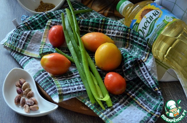 Добавить фисташки, заправить салат масляно-горчичной смесью, перемешать, поперчить. Я не солила. Подать к столу.