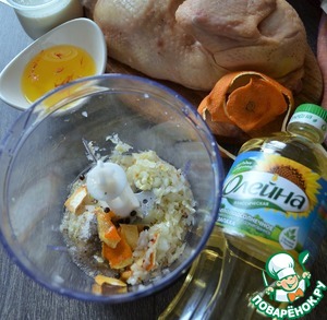 Тушку курицы проколоть ножом в нескрольких местах. Тщательно смазать маринадом изнутри.