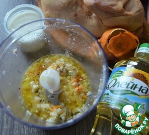 Влить растительное масло (я использую растительное масло ТМ "Олейна", качество на высоте), сок лимона, шафрановый настой. Ещё раз взбить блендером.