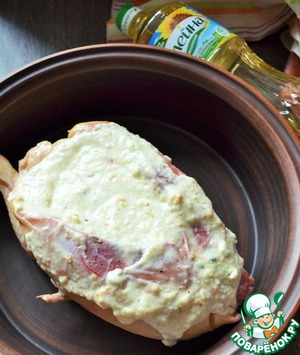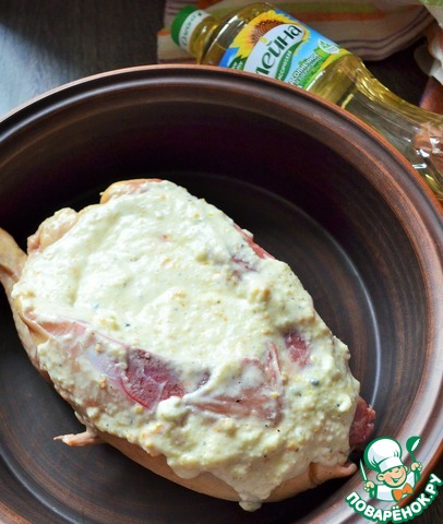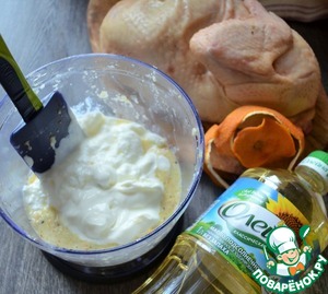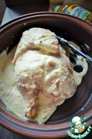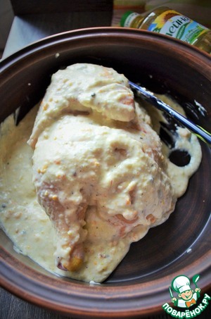 Перевернуть и нанести остатки маринада на курицу, промассировать. Оставить на 2-3 часа, возможно и на ночь, но тогда убрать в холодильник.
