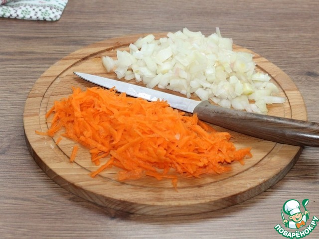• 8. Приготовим пассеровку. Лук, чеснок и морковь очищаем и нарезаем: лук - кубиками и мелко чеснок. Морковь натираем на крупной терке.