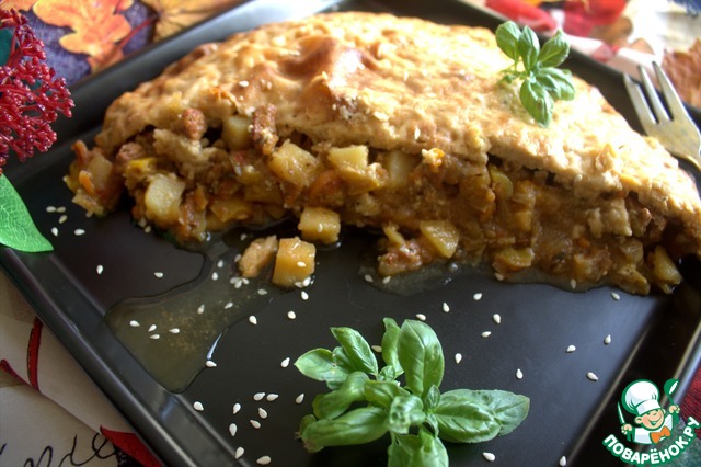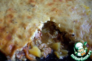 Необычное горячее блюдо. Под интересной запечённой шапочкой скрывается мясное рагу, которое понравится мужчинам. Не сложно готовить, но Ваш ужин будет выглядеть по-новому. Хватит на большую семью.