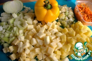 Подготовить овощи, нарезать кубиком, морковь соломкой.