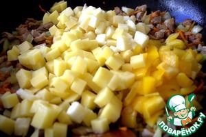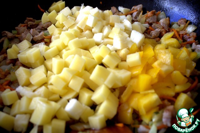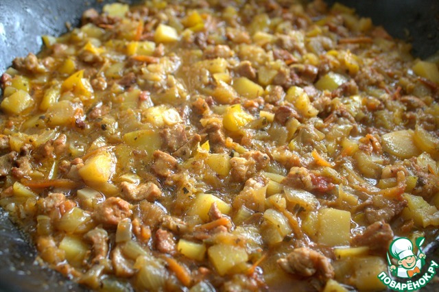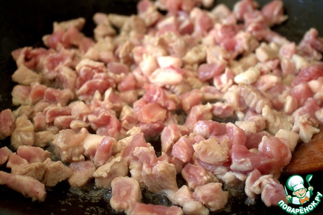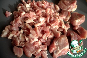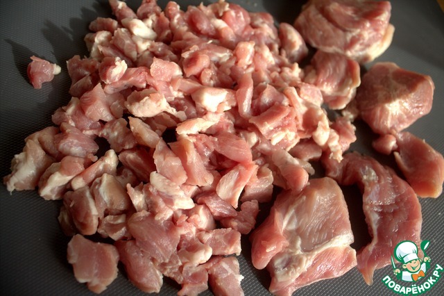 У меня была пачка свинины для гуляша. Нарезала мелко. В оригинале используется фарш.
