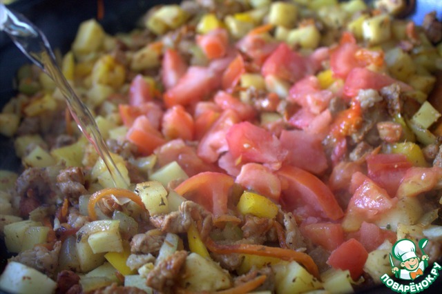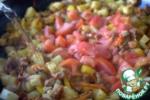 Нарезать помидор, влить воду.
