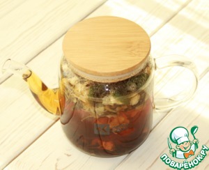 Чайник ополоснуть кипятком, затем поместить в него все ингредиенты.