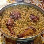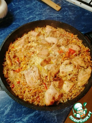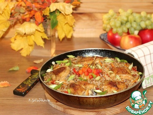 14. Сверху раскладываем кусочки курочки и немного топим их в гречке. Накрываем сковороду крышкой и готовим еще минут 10-15. Можно доготовить блюдо в духовке.