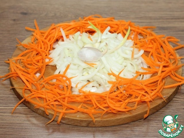 4. Подготовим овощи. Очищенные лук и морковь нарезаем: лук полукольцами и морковь - соломкой.
