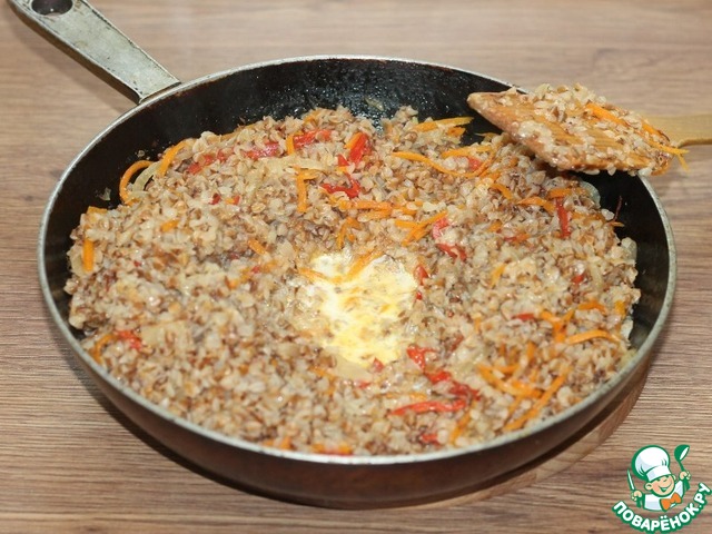 10. Добавляем к овощам немного пропитанную, "распухшую" гречку...