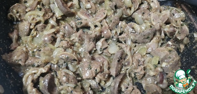 В сковороде разогреваю подсолнечное масло "Олейна". Выкладываю и обжариваю на сильном огне подготовленные куриные желудочки и сердечки. После того как потрошки подрумянятся, добавляю печенку. Отдельно обжариваю репчатый лук и соединяю с потрошками.