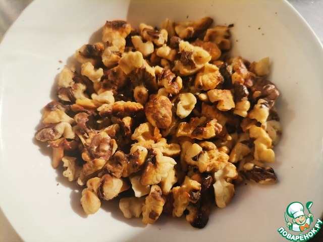 Грецкие орехи необходимо обжарить и порубить не мелко.
