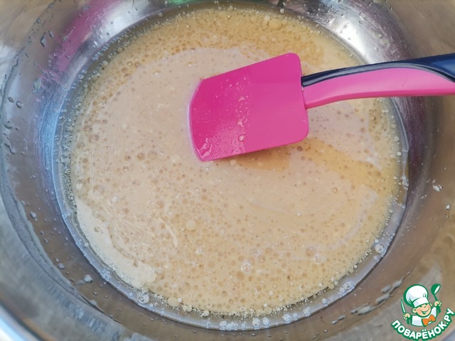Добавить мучную смесь и хорошо перемешать венчиком.