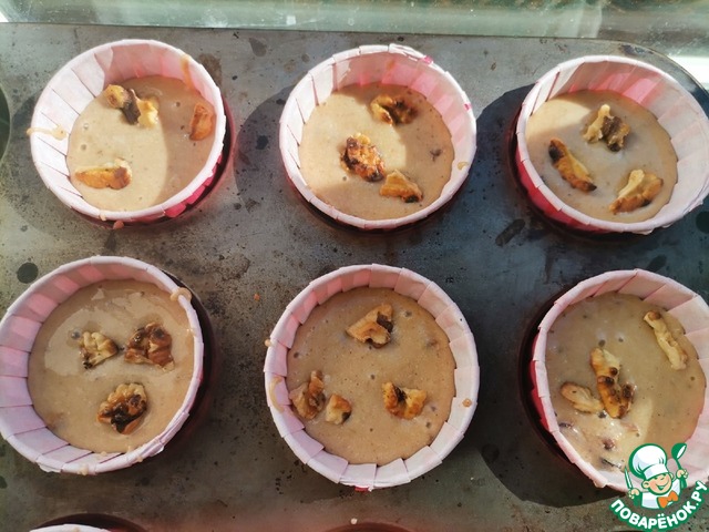 К тесту добавить часть орехов и разлить по формам. Наполнять формочки на 3/4. Сверху посыпать оставшимися орехами.