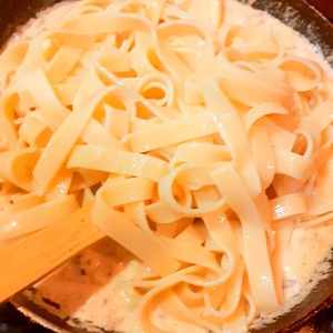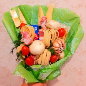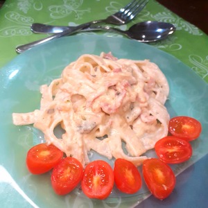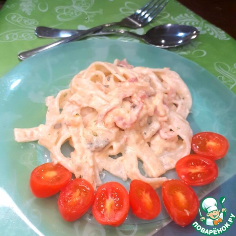 Вкусное сытное всеми любимое блюдо. Сливочный соус, аромат бекона, чеснока и грибов отлично дополняют друг друга. Приготовление блюда возникло из букета, который мне подарили. Из него и готовила!