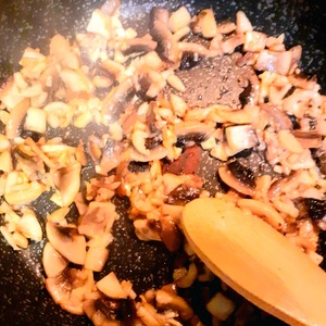 К чесноку добавить нарезанные грибы и поджарить до золотистого цвета. Выложить в отдельную мисочку