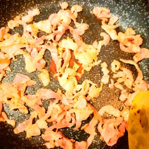 Отдельно обжарить бекон. Здесь кому как нравится: я не люблю его хруст, поэтому чуть не дожариваю