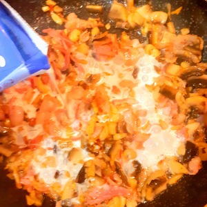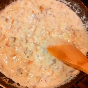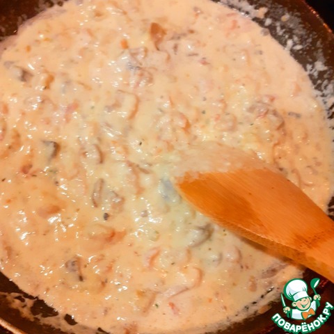 Соединяем грибы с чесноком и бекон, добавляем сливки, соль, перец. Накрыть крышкой и тушить до загустения.