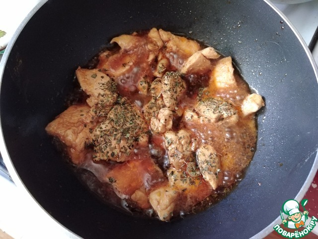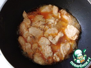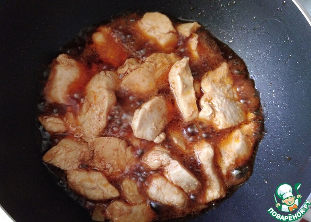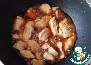 Выкладываем кусочки филе. Обжариваем, постоянно мешая, так же на большом огне буквально несколько минут.