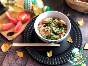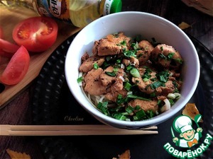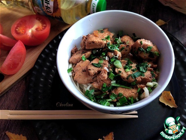 Я подам филе с рисовой лапшой Удон и присыплю зелёным луком блюдо. Можно подать с рисом...