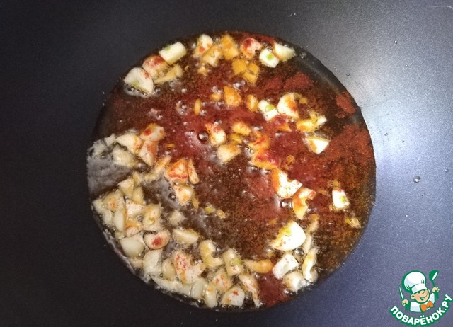 Чеснок режем отправляем в разогретое масло, добавляем перец кайен (острый жгучий) и обжариваем 1-2 минуты, постоянно помешивая, на большом огне. Сильно чеснок не обжаривайте, это скажется на вкусе.