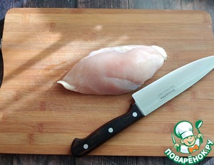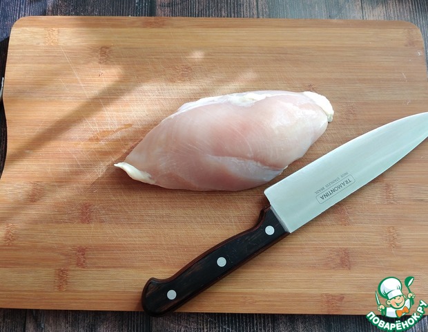 Берём филе куриное без кожи и плёночек. Нарезаем произвольно кусочками.