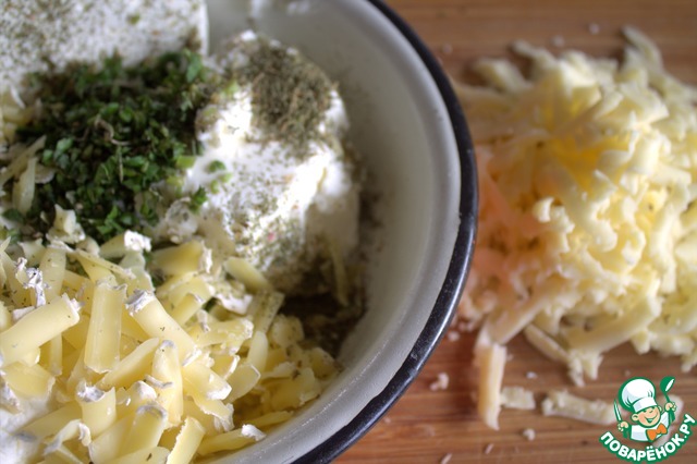 Для начинки можно взять творог и сыр пополам. У меня начинка сборная из серии "остатки сладки": 1,5 пачки творога+брынза 0,5 пачки и подсохший сыр бри (он, кстати, отлично натирается на тёрке).