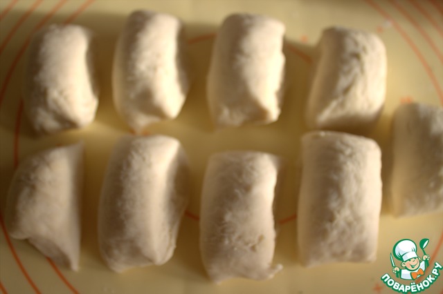 Тесто положить на стол с мукой, вытянуть в колбаску и поделить на порции.