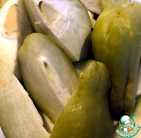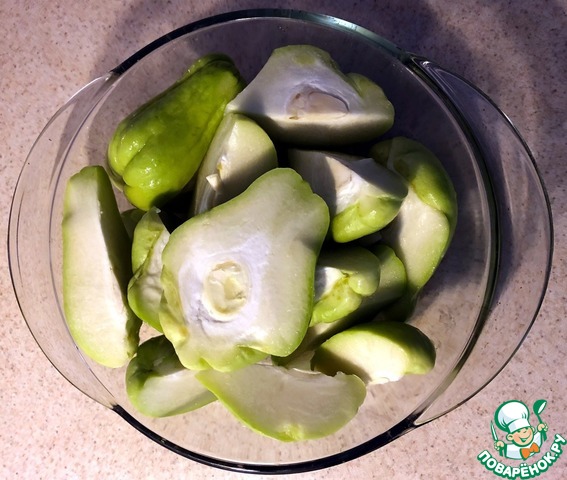 2. Режем чайот пополам или на 4 части для запекания под крышкой с небольшим количеством воды.