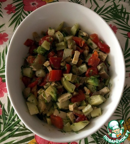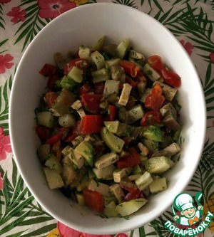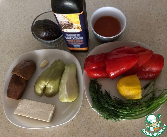 Блюдо посвящается всем любителям тофу и овощей. Печеный чайот (мексиканский огурец) по вкусу похож чем-то на кабачок, поэтому, при необходимости, может быть им заменен. Полноценное блюдо, богатое как белками из тофу и чайота, так и углеводами (из перца, баклажан и чайота), так и жирами (из авокадо и льняного масла). Томатный сок добавляет порцию полезного ликопина. Чеснок, лимонный сок и укроп - используются для усиления вкуса овощей.