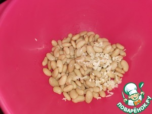 Фасоль промыть кипячёной водой и откинуть на дуршлаг. Чеснок мелко порубить или пропустить через пресс.
