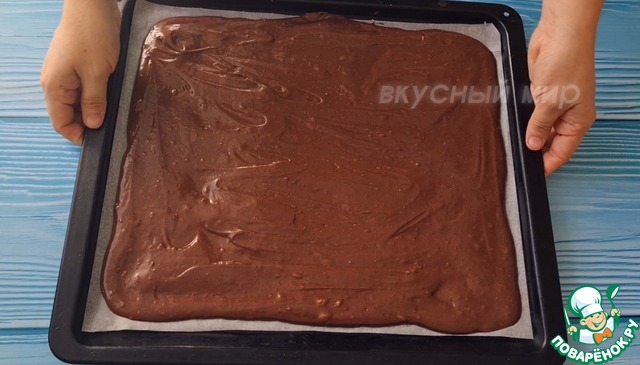 Противень застелить пергаментом. У меня большой противень. Вливаем тесто и выпекаем при 170° примерно 35-40 минут