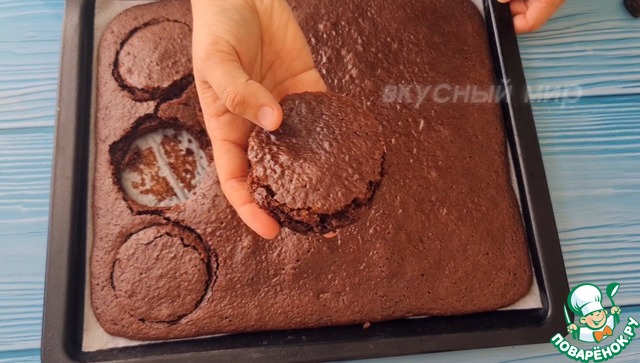 Далее остужаем бисквит. Остывший бисквит вырезать на кружочки.
