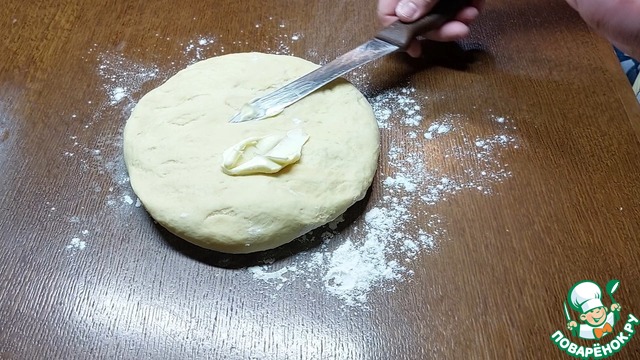 Как только добиваемся необходимого результата, посыпаем рабочую поверхность мукой и выкладываем тесто. Слегка разравниваем и выкладываем на него половину от общего количества сливочного масла (примерно 20-25 г).
