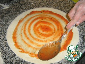 Пицца готова к жарке.Нанизываем на лопату и ставим в печку.