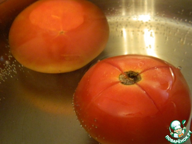 Помидоры опустить в кипяток на минуту, достать из воды и снять шкурку.