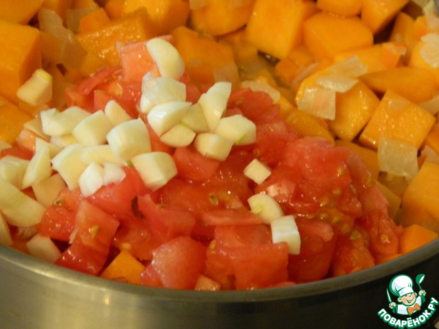 Процесс обжаривания продолжить, добавив мелко нарезанные помидоры и чеснок, всего пару минут.