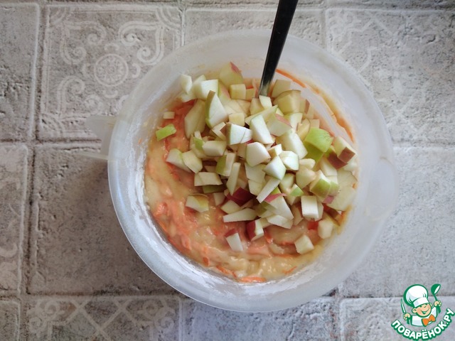 Яблоко нарезаем мелким кубиком и отправляем в тесто.