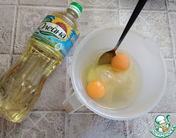 В посуду сыплем сахар, разбиваем яйца, добавляем масло подсолнечное. Я буду использовать ТМ Олейна подсолнечное. -