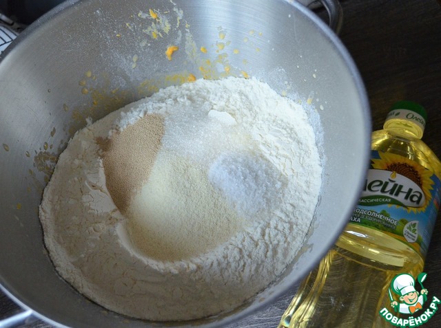 Добавить сахар, дрожжи, соль. Смешать до однородности.