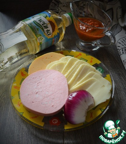 Колбасу нарезать мелким кубиком, мягкий сыр натереть на тёрке. Разложить на заготовку.