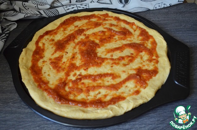 1/3 теста раскатать в круг, перенести в форму, смазать томатным соусом или кетчупом.