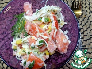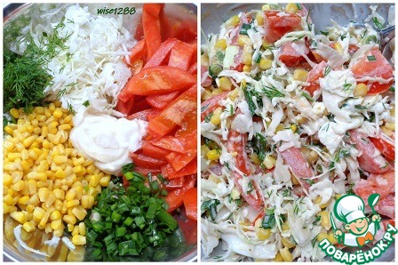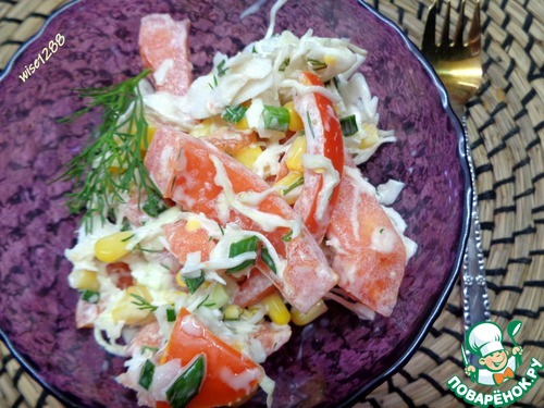 Сочный и хрустящий салат из капусты с помидором и консервированной кукурузой – универсален. Свежие овощи довольно ароматны и вызывают желание попробовать салат незамедлительно.