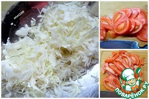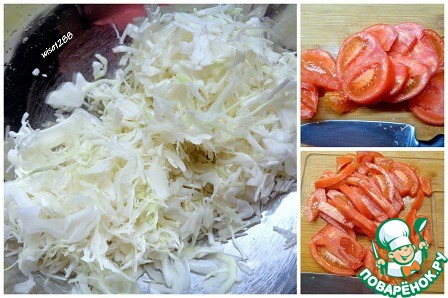Капусту тонко нашинковать. Помидор нарезать произвольно.
