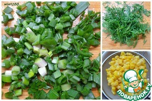 Зеленый лук и укроп нарезать мелко. С консервированной кукурузы удалить жидкость.