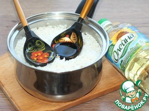 1. Отвариваем рис до полуготовности, воду сливаем. Добавляем в рис соевый соус 2 ст. л. и подсолнечное масло 1-2 ст. л., перемешиваем.