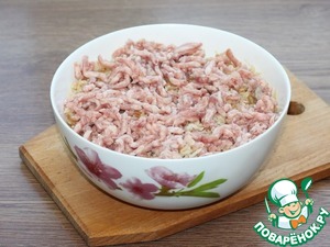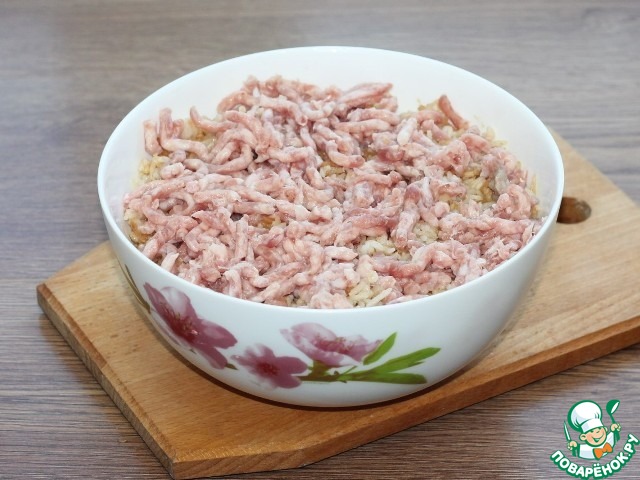 2. В большую миску выкладываем рис и мясной фарш, добавляем приправу для мяса, соль и перец, перемешиваем.