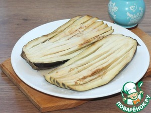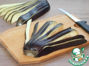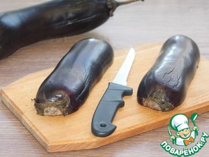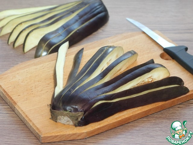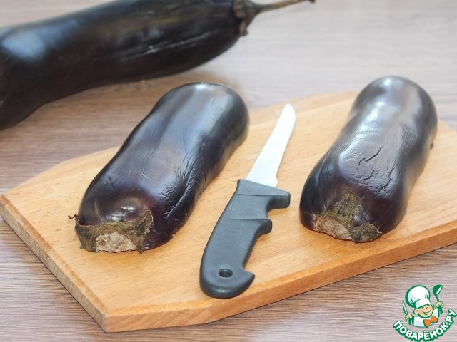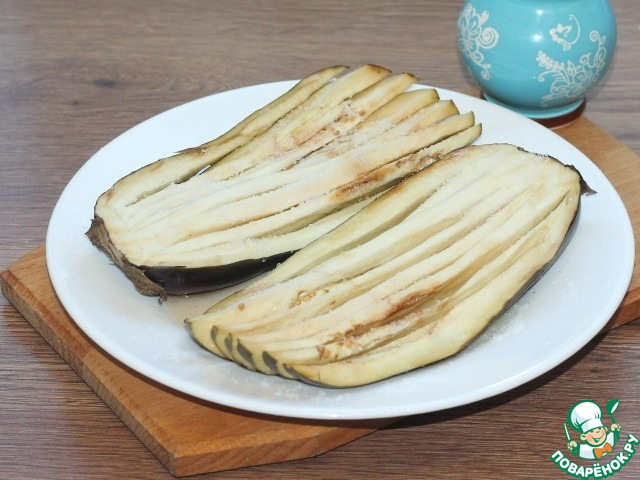 4. На половинках баклажан делаем надрезы не дорезая немного до плодоножки.