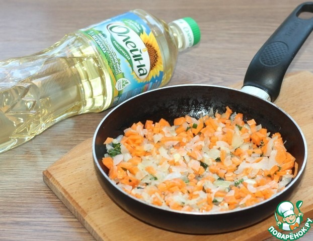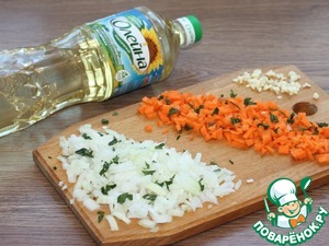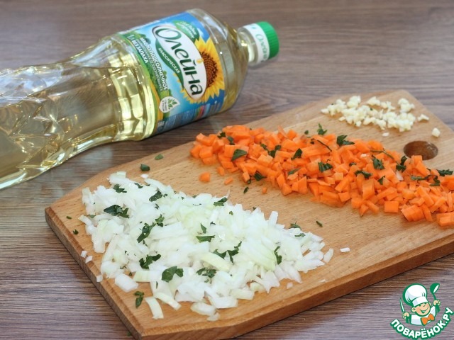 6. Приготовим начинку. Овощи очищаем и нарезаем, лук и морковь - кубиками, мелко рубим чеснок.