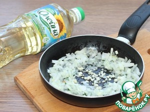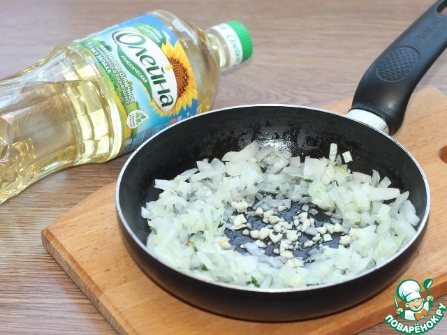 7. На разогретом подсолнечном масле обжариваем лук, через 2-3 минуты добавляем чеснок, жарим минуты 2.